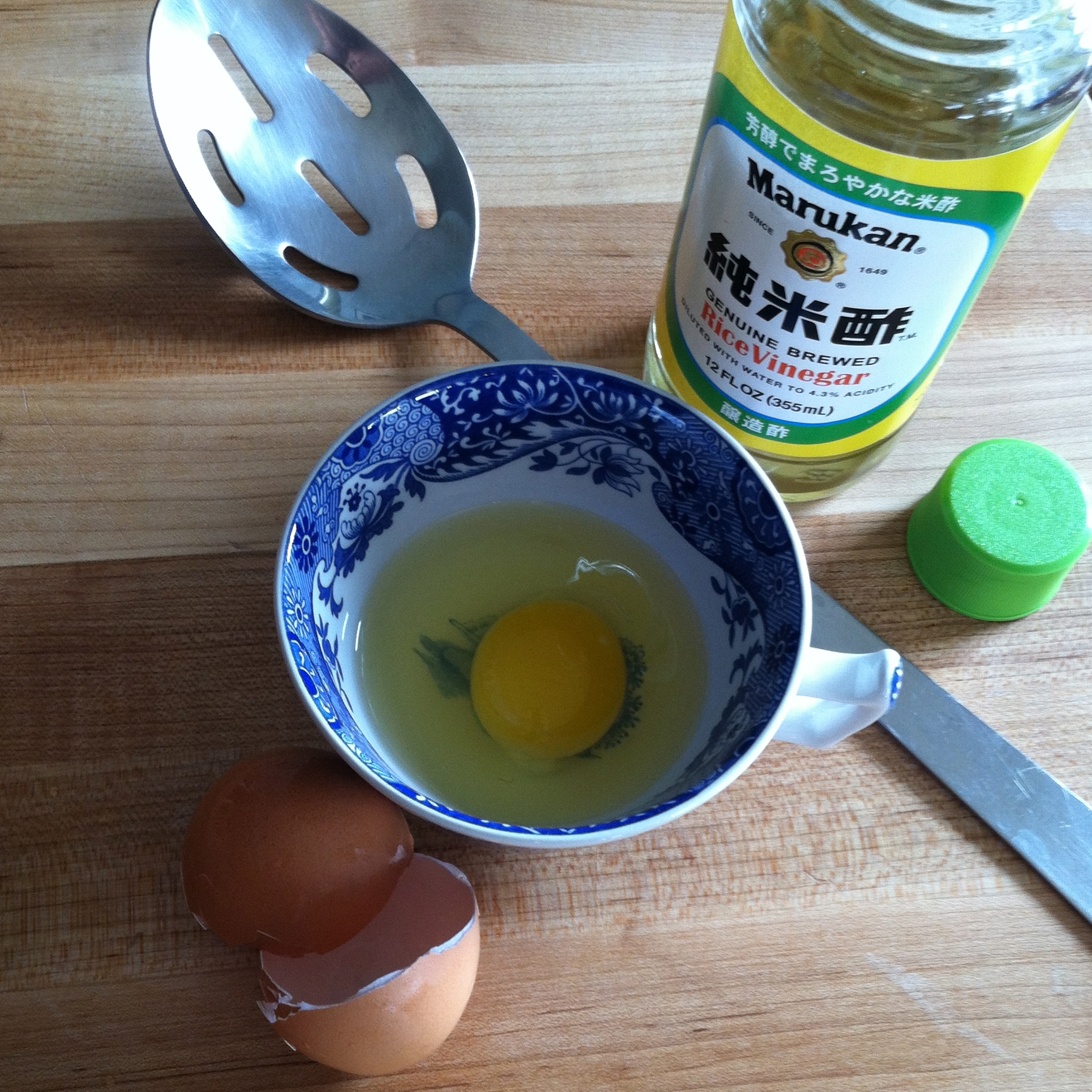 By splash I mean about 1 Tablespoon, though I never measure. Just be judicious with your splashing because too much vinegar produces a poached egg that is spongy, sour-tasting and anything but great. Use any white vinegar you have on hand. Rice vinegar is my favorite for poached eggs so I always have some in my pantry (it’s also great for making Asian style peanut dressing!).